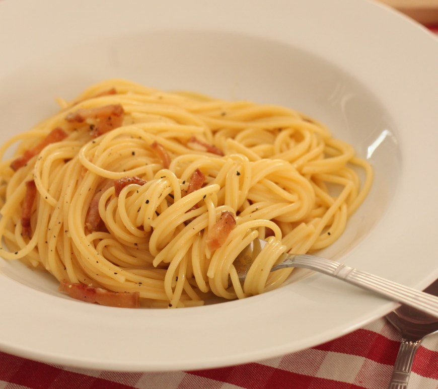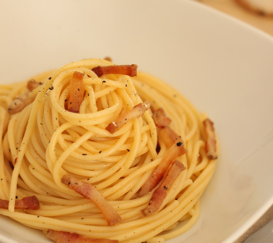 - Le Guanciale est de la joue de porc, c’est un morceau assez gras (mais de qualité supérieure !) il est frotté avec des épices et des aromates avant d’être mis à sécher pendant plusieurs semaines, et c’est vraiment grâce à lui que la Carbonara a ce goût si caractéristique. Il est vrai que ce n’est pas facile d’en trouver en France, le seul moyen de s’en procurer c’est d’aller dans une épicerie fine italienne ou chez un boucher italien, et parfois ils n’en ont pas ! Si vous n’en trouvez pas, vous pouvez remplacer par de la pancetta, de la poitrine fumé ou encore des lardons. Pour les Grenoblois, j’ai trouvé du guanciale à l’épicerie fine Italia Uno, Espace Comboire – 11 Rue des Montagnes de Lans, 38130 Échirolles.